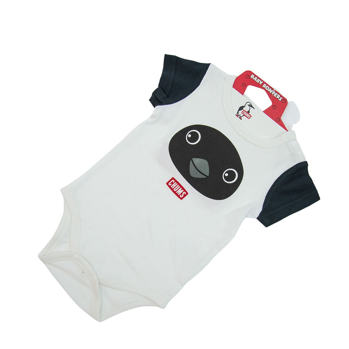 可以穿到 1 歲左右。 100%純棉材質,對肌膚溫和。側面有兩個姓名標籤,肩膀和胯部有兩個按扣,方便穿脫。可愛的設計,正面印有 Chums 圖示和鰹鳥的臉。不僅適合日常使用,也推薦作為慶祝分娩的禮物。